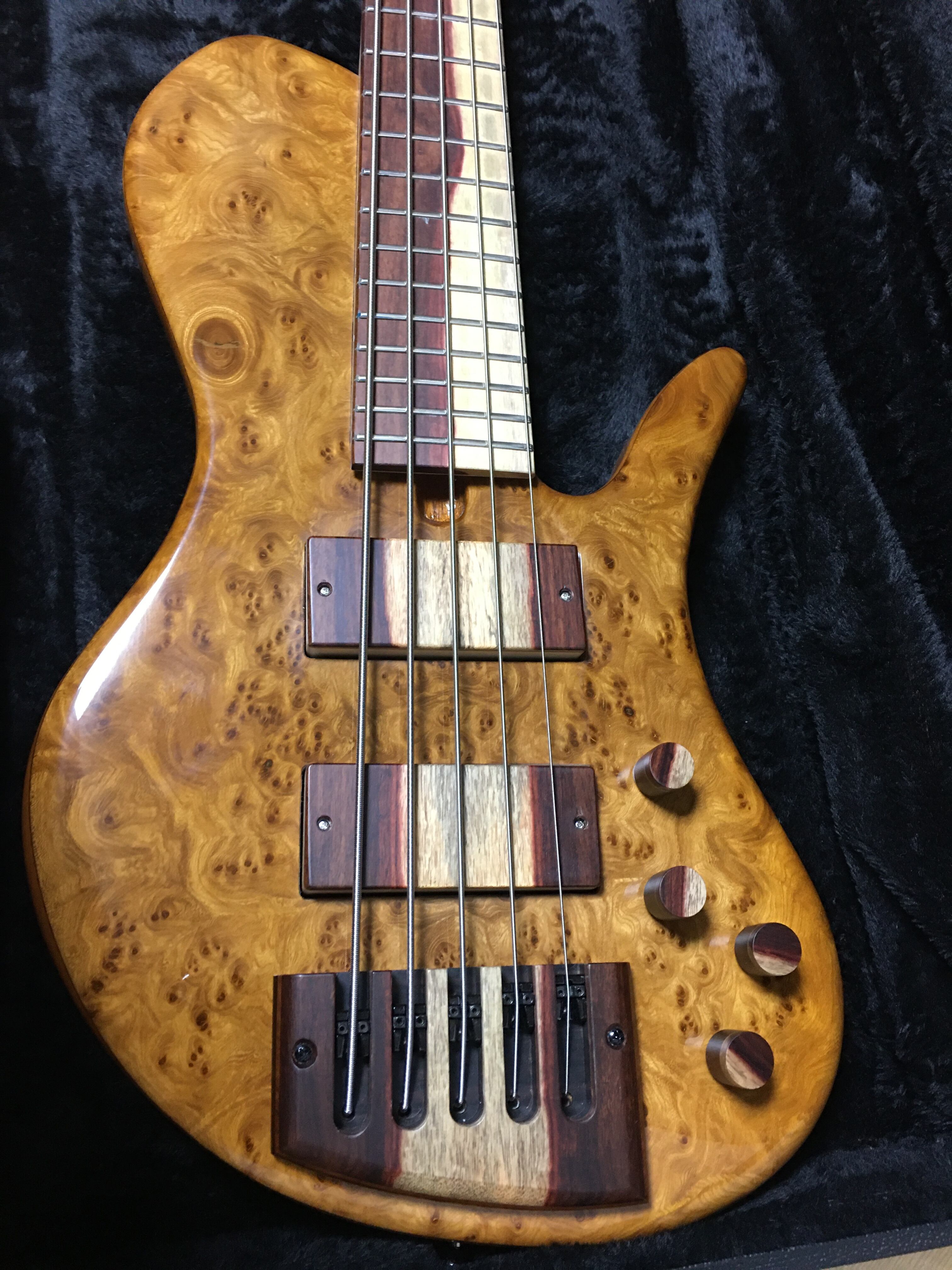 独特の木目をしたアンボイナ・バールをトップに、ローズウッドに似た特性を持つグラナディロを指板や各パーツにマッチングさせ目を引く一本に仕上がりました。