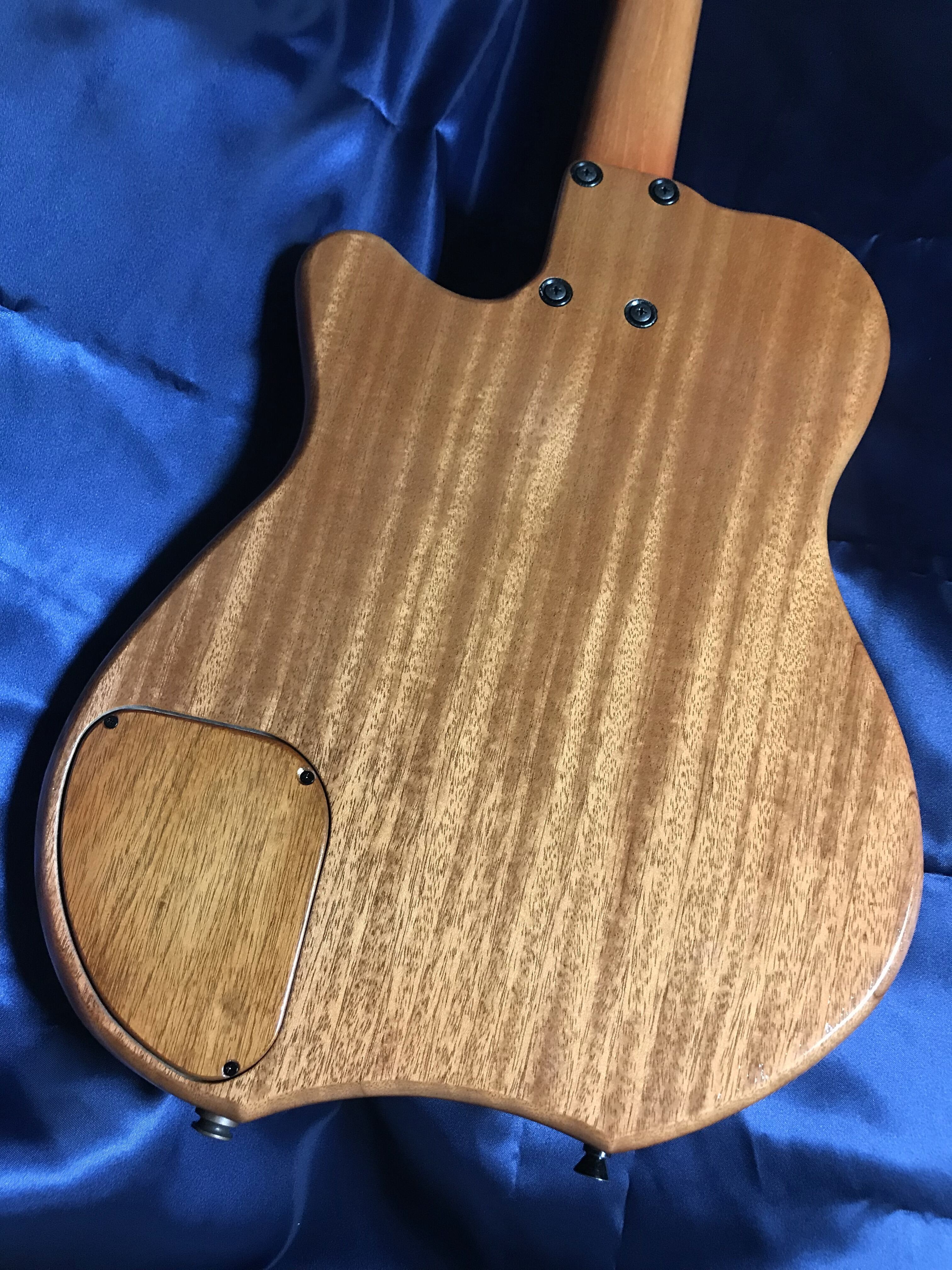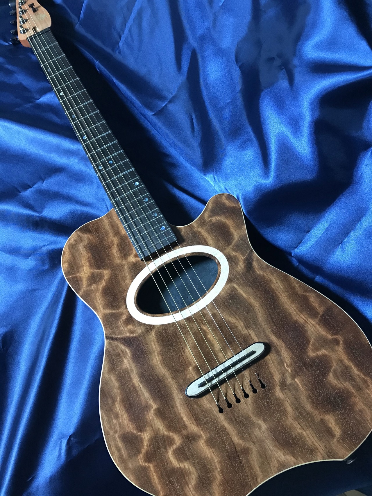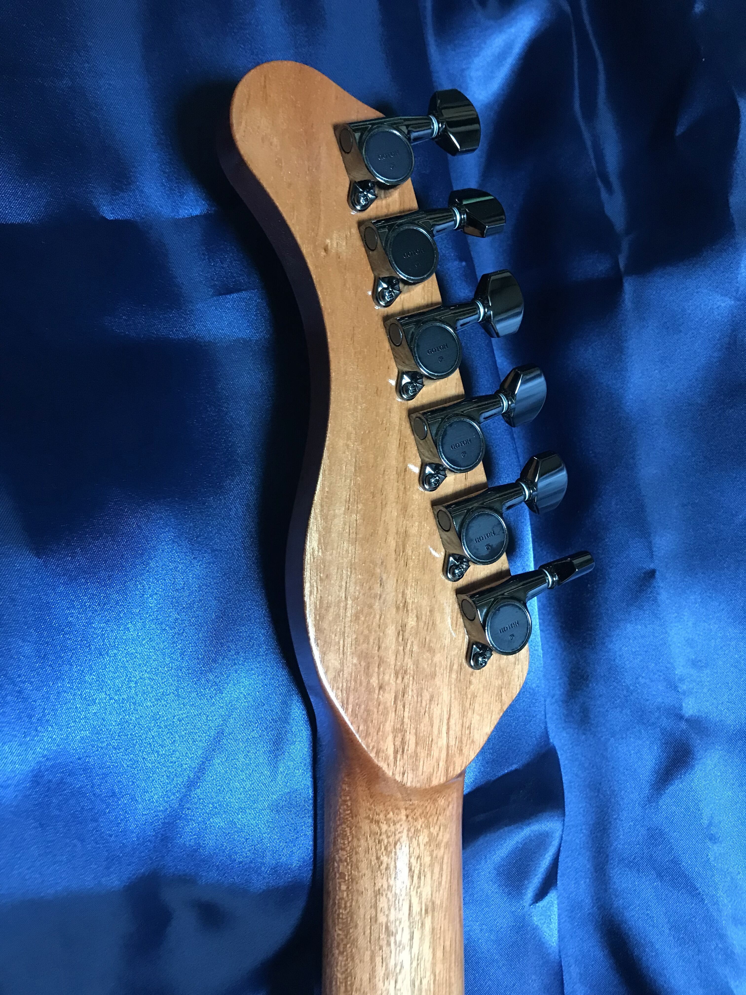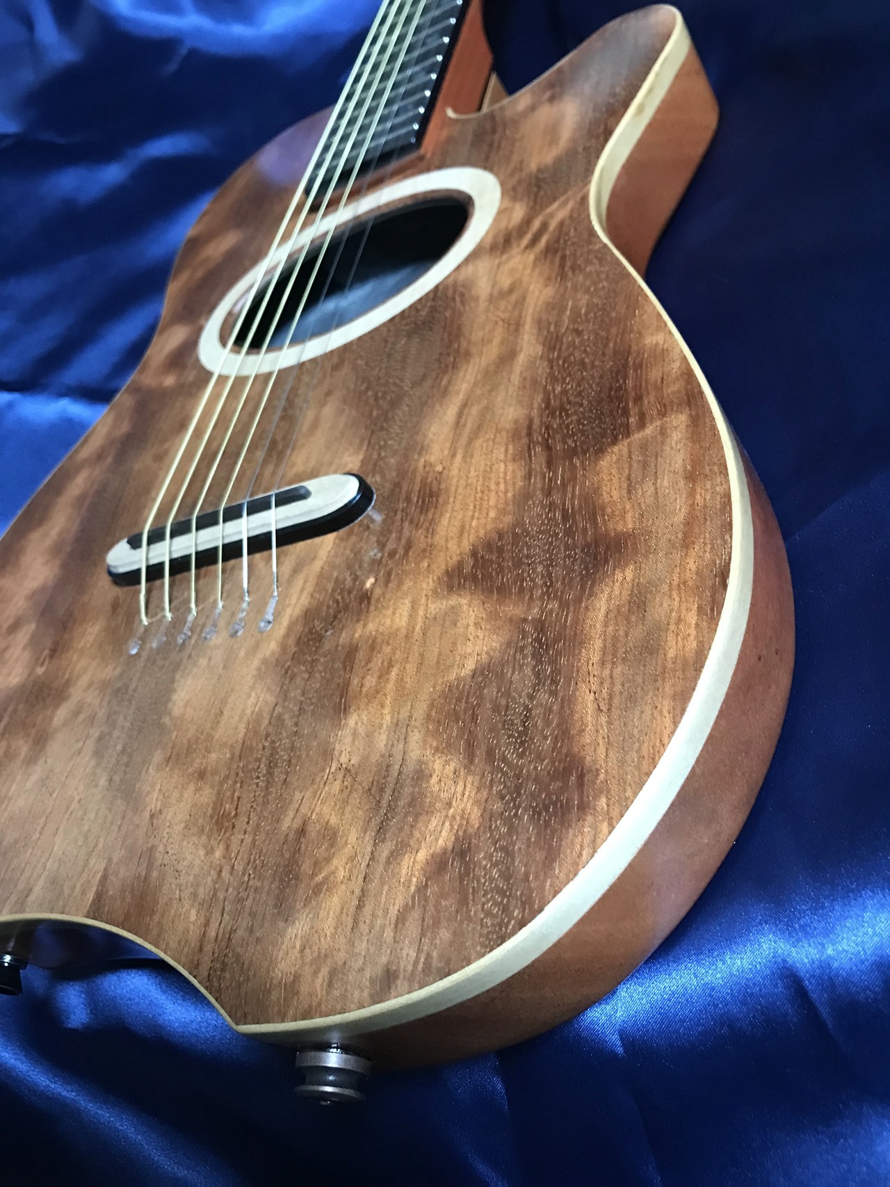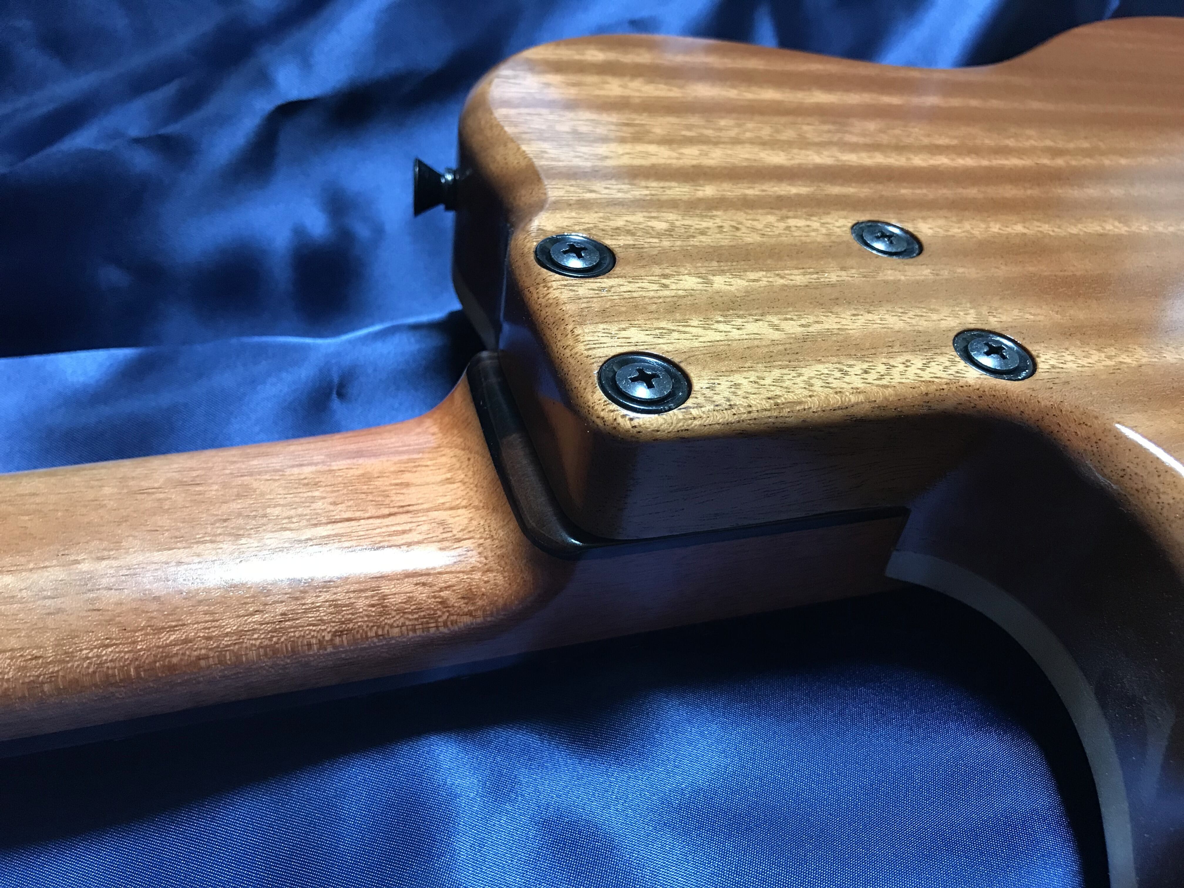 大胆にマホガニーの1枚板をくり抜いたボディからはふくよかなローミッドを出力し、美しく硬質なキルトブビンガがサウンドに張りと抜けをプラスします